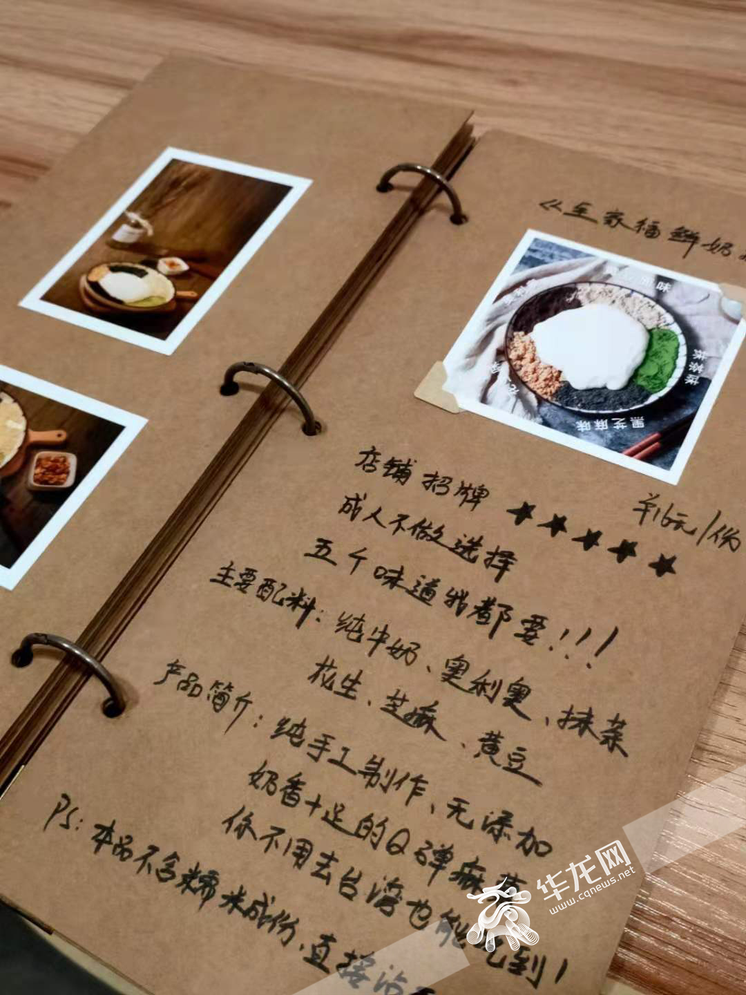 桌上摆放着一本厚厚的菜单,硬质的牛皮纸上,有对每一款甜品的手写详细介绍,细心的写上了配料和注意事项,让顾客按需选择;此外,每一页菜单上还粘贴着与之对应的图片,诚心满满。店内的产品是纯手工制作而成,以米、豆、奶为原材料,这也是“三样子”的由来,一米、一豆、一奶更是拼凑出了数十款美味。产品不仅价格便宜,同时,如今“甜品不甜”成了许多人对甜品的最高评价,主打低脂、低糖、低卡的“三样子”,在健康好吃方面又增一分,减肥期间嘴馋,来试试这里的甜品或许是个不错的选择。